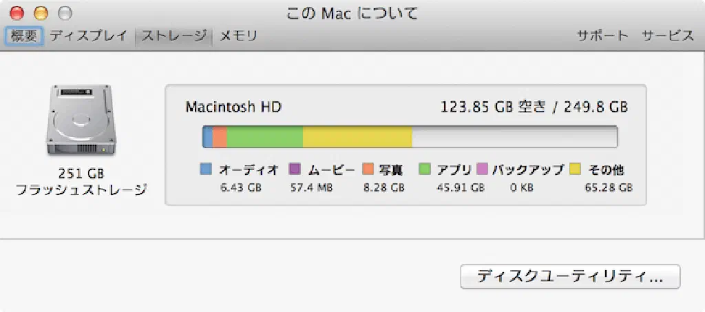 Mobile Time Machine 停止直後のストレージの情報は下図のようになっています。「バックアップ」に注目してください。「0KB」となっているのがお分かりいただけるかと思います。