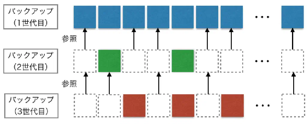 2 世代目のバックアップはどうでしょうか。ローカルディスクの内容をすべて取得するのではなく、1 世代目のバックアップから変更のあった箇所のみをバックアップします。しかし、このままでは 2 世代目のバックアップから復旧することができませんから、変更のなかった箇所については 1 世代目のバックアップを参照するようにします。3 世代目以降も同様です。
