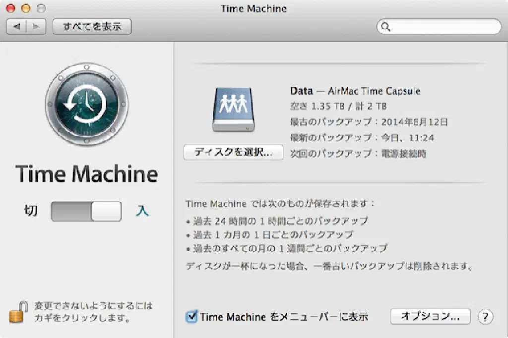 以降、Time Machine に接続されているディスクのことを、バックアップディスクと呼びます。