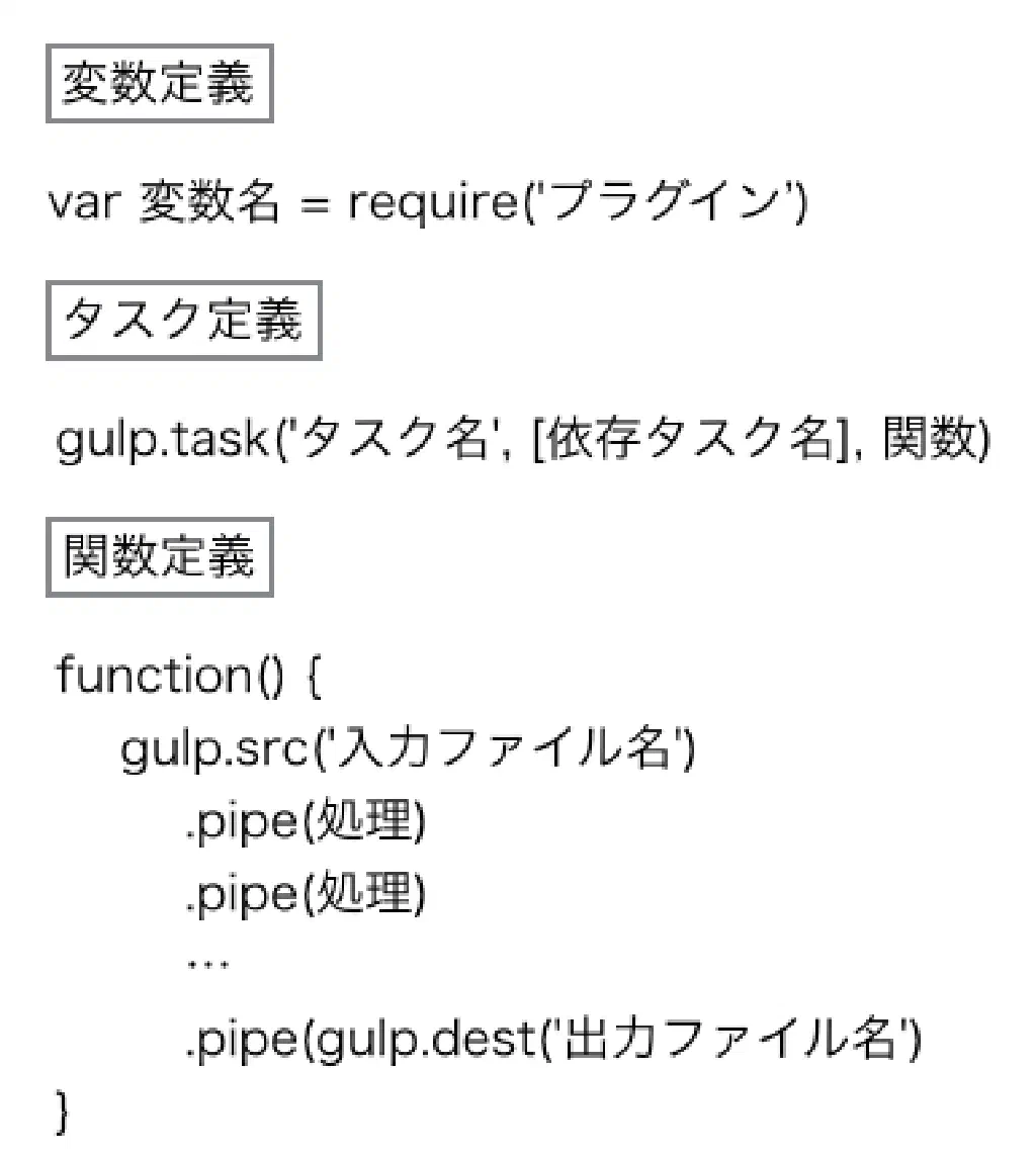 gulp.jsによるタスクの定義は、「gulpfile.js」に記述します。「package.json」と同階層に作成してください。「gulpfile.js」の構造は以下の通りとなっています。こちらについて実例を通して説明したいと思います。まずは、CSSファイルを圧縮するタスクを作成します。