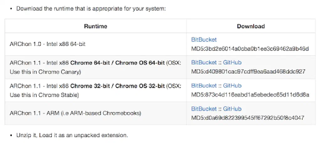 まずは、macOSのChrome上でAndroidアプリを動作させるためのエミュレーターをchromeos-apkからダウンロードします。注意点として、現状の安定板であるChromeは64bit版が提供されていないため、32bit版をダウンロードするようにしてください。