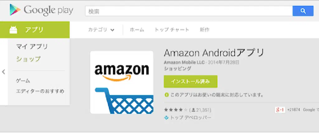 次に目的のアプリをGoogle Playで検索します。今回は分かりやすい例として「Amazon」アプリにしましたが、他のアプリケーションでも構いません。