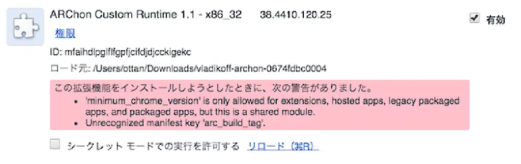 次に「パッケージ化されていない拡張機能を読み込む」を選択し、先ほど解凍したARChonのフォルダーを選択してください。すると何点か警告が表示されます。以下に類似する警告であれば問題なく動作しますので、そのまま進めてください。