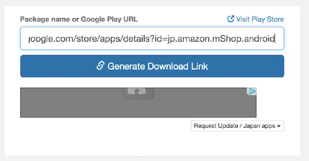 次に、APK Downloader [Latest] Download Directly | Chrome Extension v2.1.2 (Evozi Official)を開いてください。テキストボックスに先ほどコピーしたURLを入力して、「Generate Download Link」ボタンをクリックします。