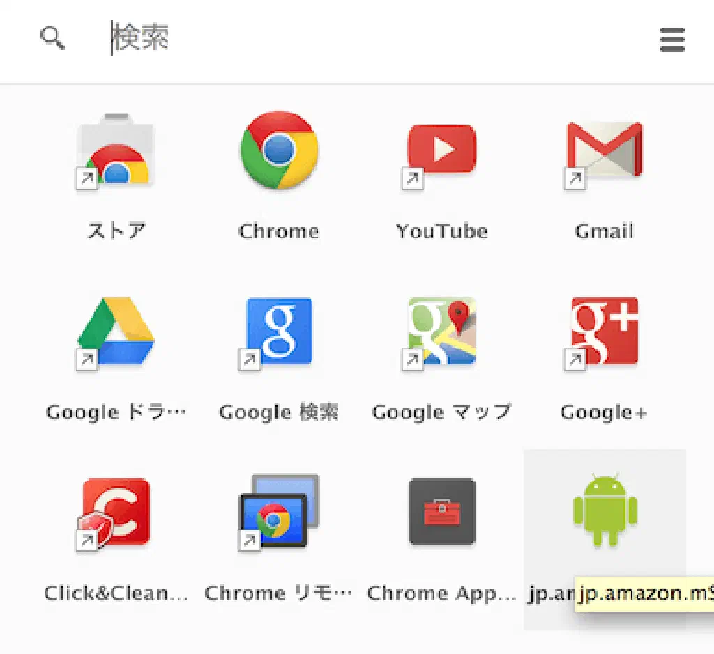 先ほど登録したAmazonアプリはGoogleのアプリランチャーに登録されています。ランチャーにアクセスするためにはブックマークバーの左端のボタンをクリックします。