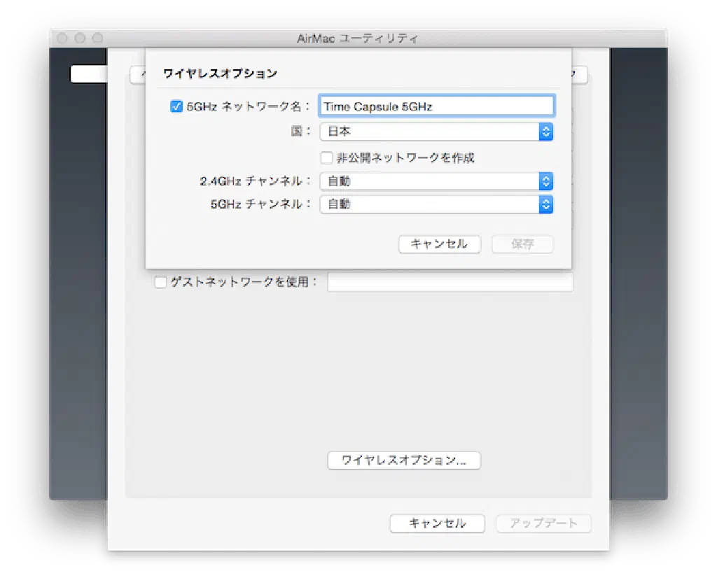 ワイヤレスオプションが開いたら、「5GHzネットワーク名」をチェックし、任意のアクセスポイントの名称(SSID)を入力します。チャンネルについては「自動」にしておくことにより、現在もっとも効率的なチャンネルをTime Capsuleが自動的に選択してくれます。これで、5GHz帯のWi-Fiネットワークの作成は完了です。