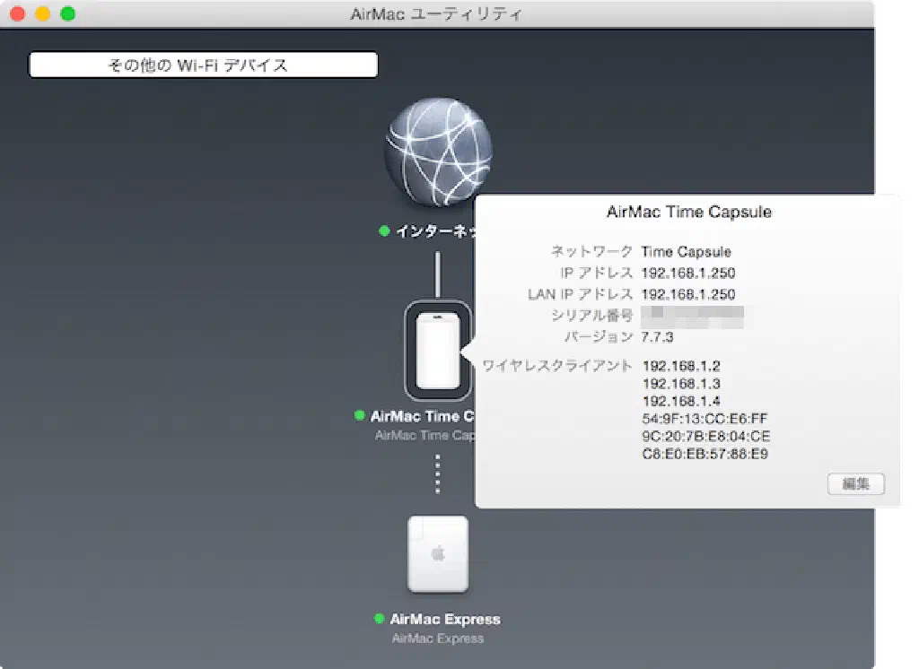 Time Capsuleで5GHz帯のWi-Fiネットワークを作成するためには、AirMacユーティリティを使用します。AirMacユーティリティを開いたら、Time Capsuleを選択し、「編集」ボタンをクリックします。はじめてアクセスする場合には機器にアクセスするためのパスワードを求められるため、あらかじめ設定しているパスワードを入力しましょう。
