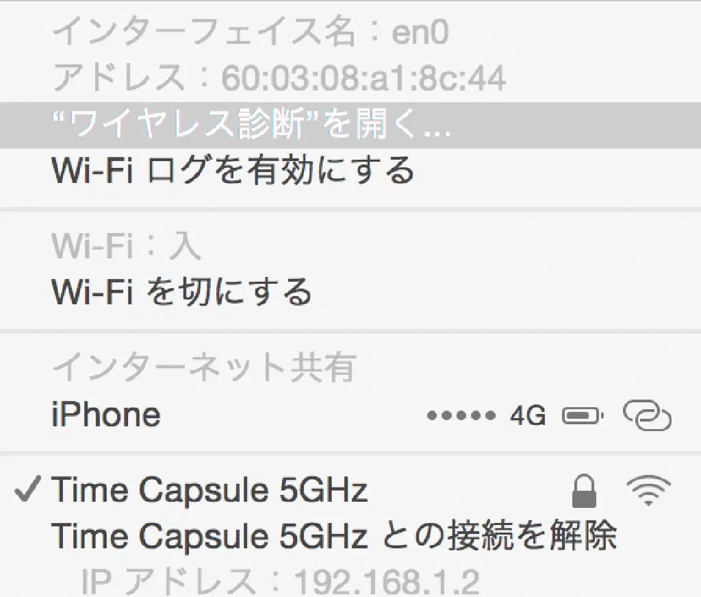 macOSにはWi-Fiネットワークのパフォーマンスやチャンネルの干渉を確認できるユーティリティが標準で具備されています。⌥を押しながらメニューバーのWi-Fiのアイコンをクリックします。アイコンをクリックすると、「“ワイヤレス診断"を開く」というメニューがあるので、これをクリックします。