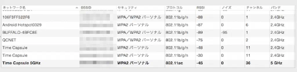 すると、ネットワーク名、プロトコル、RSSI、ノイズ、チャンネル、バンドといった、デバイスの検索範囲内のワイヤレスネットワークの一覧が表示されます。太字のネットワーク名が現在接続されているWi-Fiネットワークです。もし、バンドが「2.4GHz」で、かつチャンネルが同一のWi-Fiネットワークが存在する場合は、チャンネルを変更することを検討しましょう。