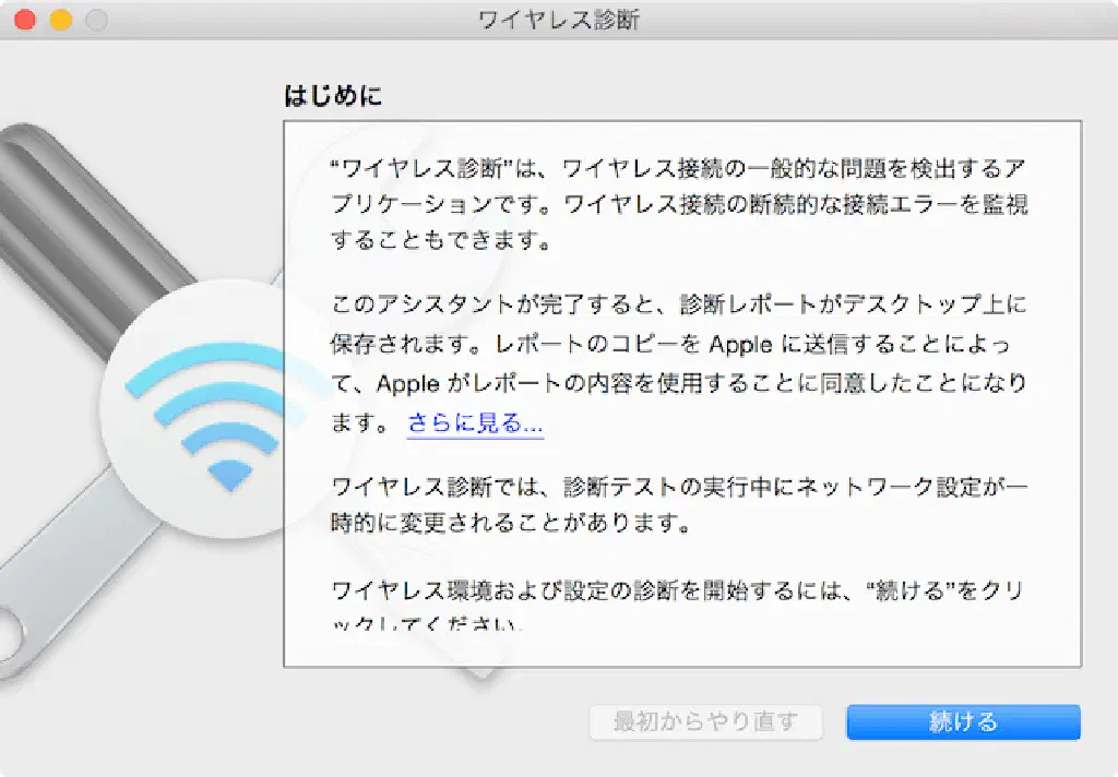 「ワイヤレス診断」が開きます。ここでは、このウインドウはそのままにして、メニューの「ウインドウ」→「スキャン」をクリックします。