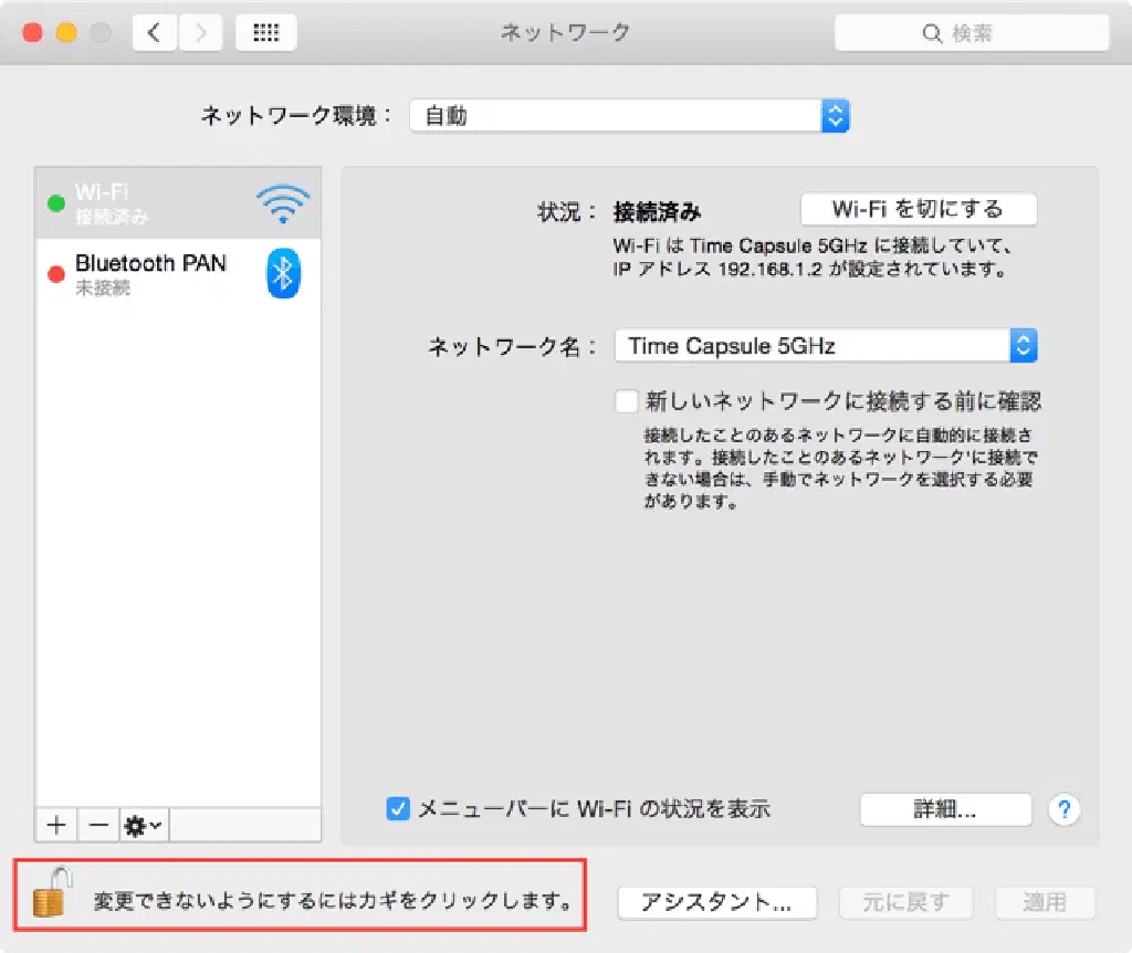 MacでDNSサーバの設定を変更するためには、「システム環境設定」→「ネットワーク」を選択し、Wi-Fiの「詳細」ボタンをクリックします。その際、左下の鍵アイコンをクリックして施錠を解除しておきましょう。