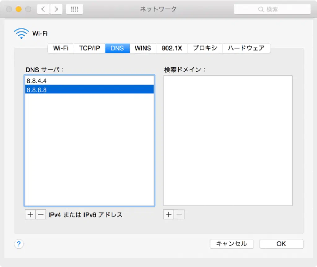 「DNS」タブを選択し、「DNSサーバ」欄の「+」ボタンをクリックし、プライマリDNSサーバ、セカンダリDNSサーバの順に追加しましょう。