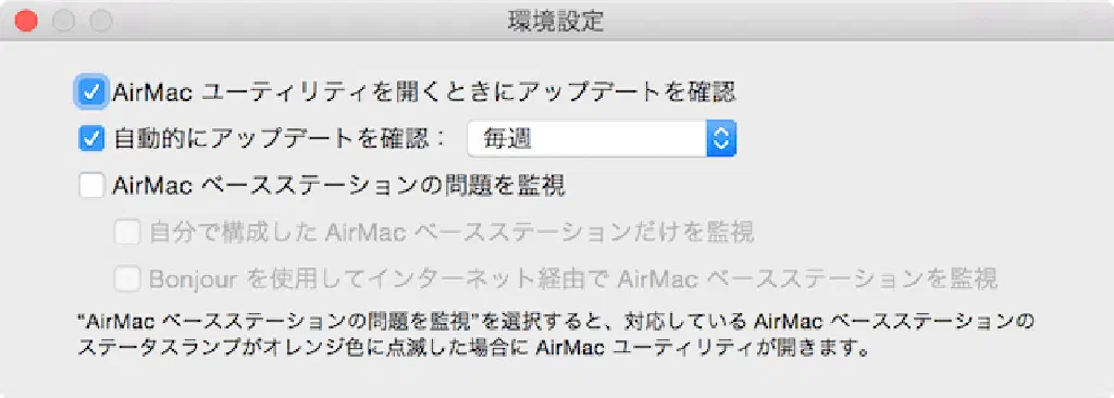 AirMacワイヤレス装置(Express、Extreme、Time Capsuleなど)を使用している場合は、AirMacユーティリティーの環境設定で自動的にアップデートを確認する設定に変更しておきましょう。