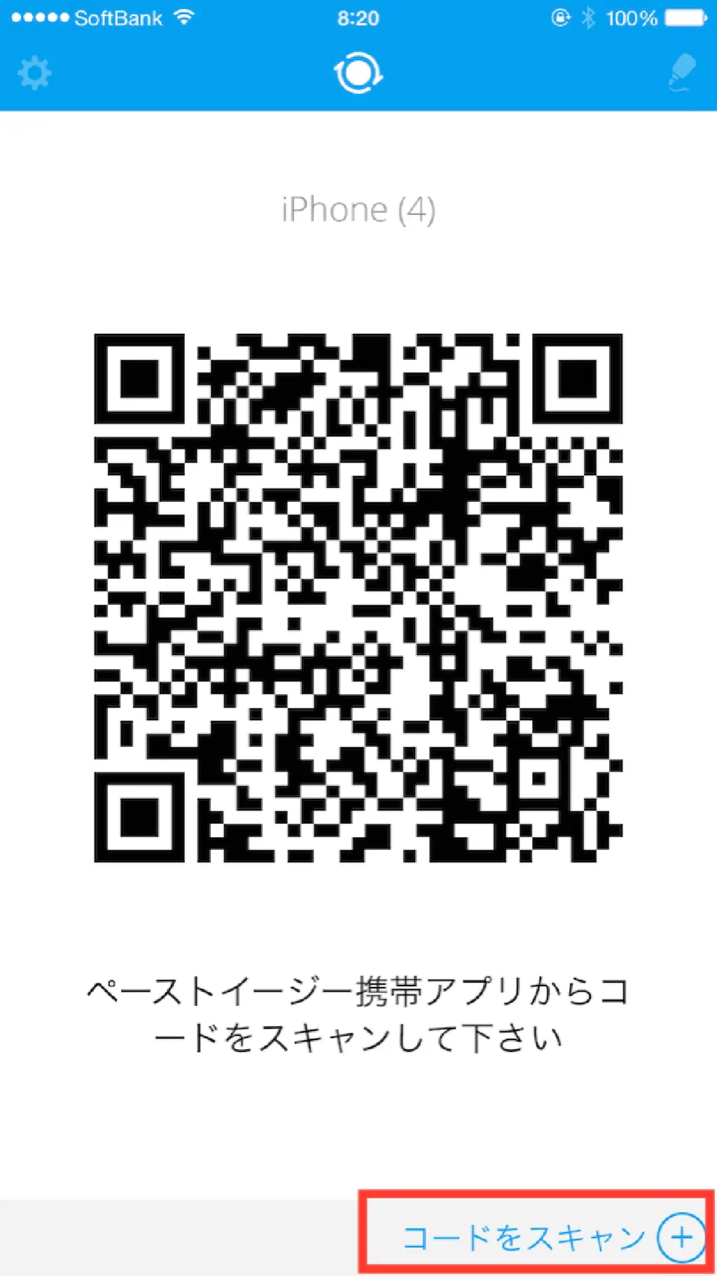 iPhone で「Pasteasy」を開いたら、右下の「コードをスキャン」をタップします。