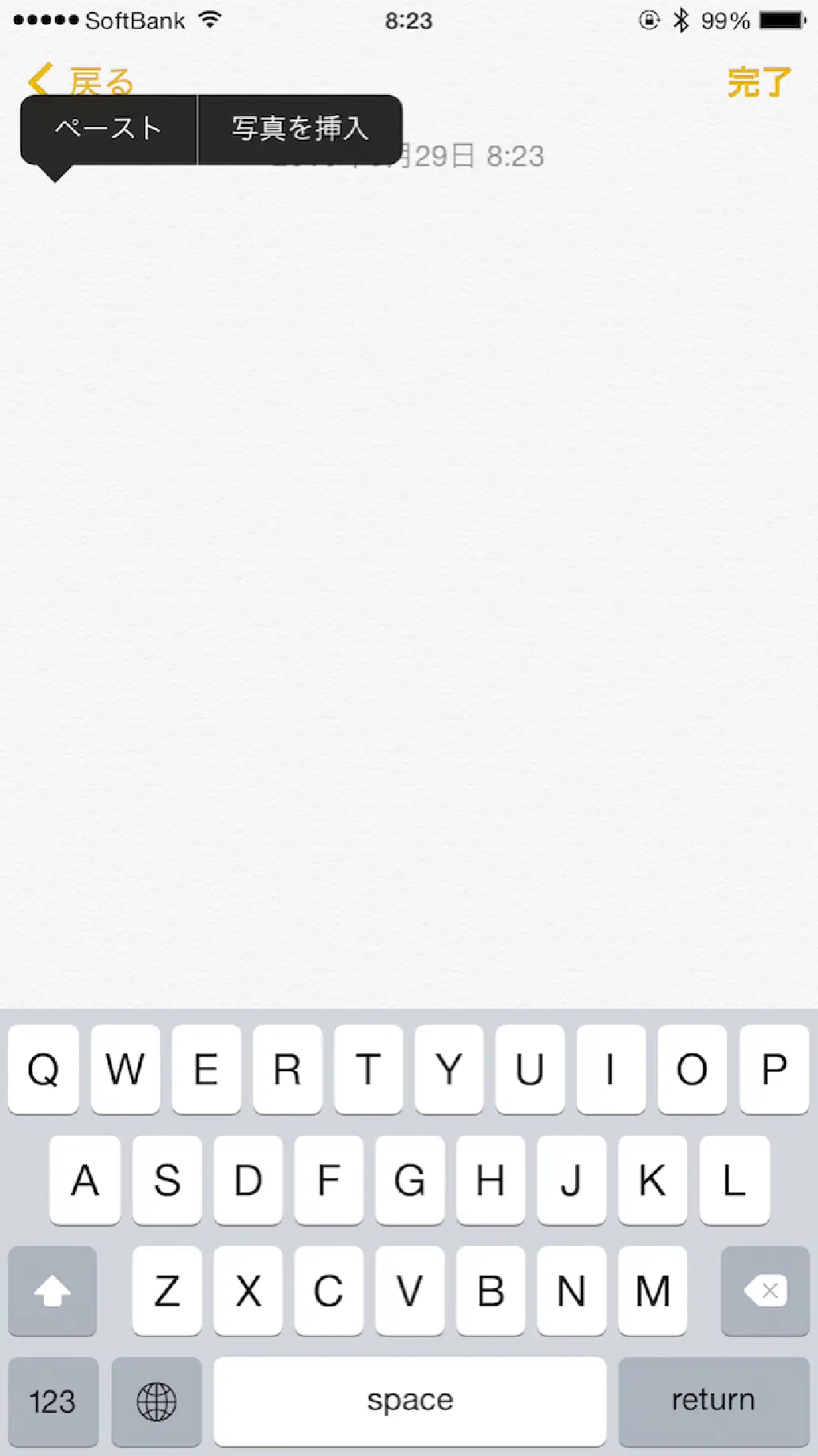 iPhone でメモ帳を開いて、「ペースト」をタップします。