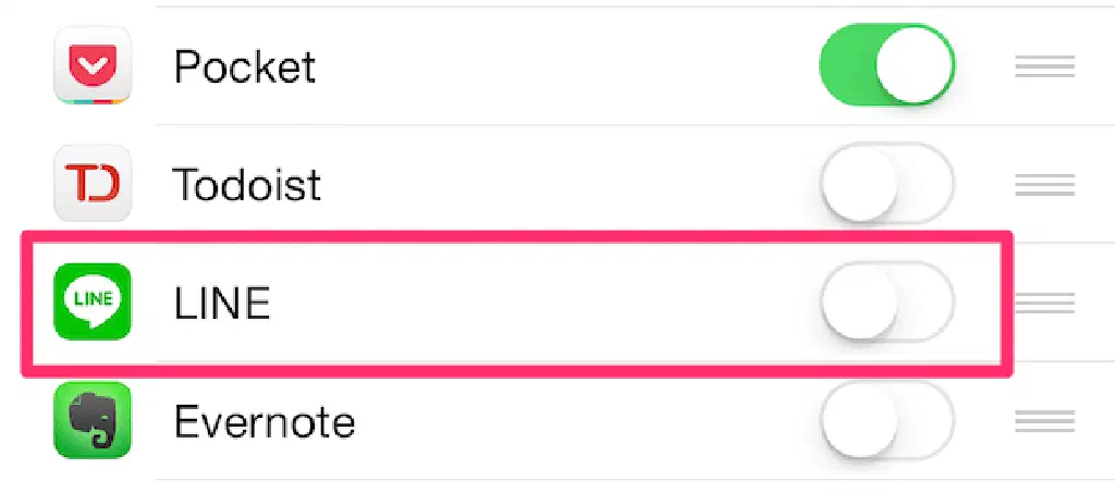 「共有」できるアプリケーションがたくさん表示されますが、その中から今回は「LINE」を有効化します。バーをスライドさせて緑色にしてください。