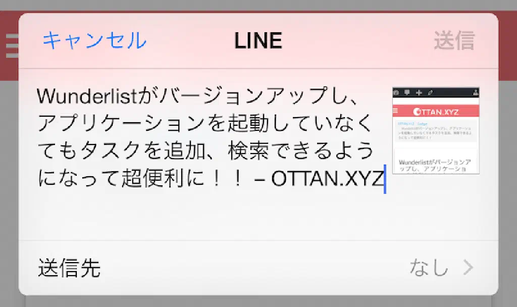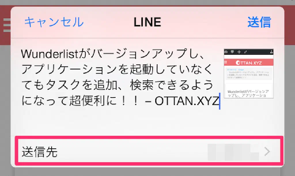 本文とURLが添付されたダイアログが表示されます。この状態ではまだ送信できません。「送信先」をタップしてください。