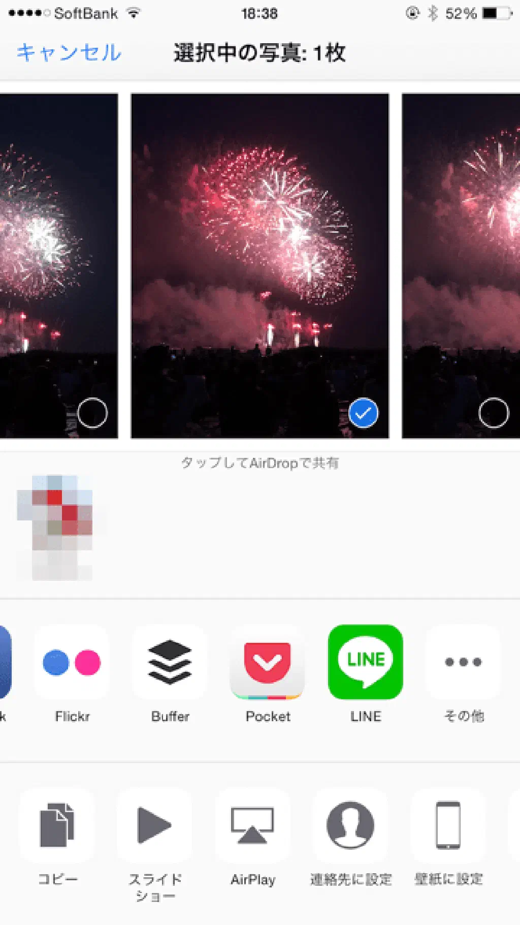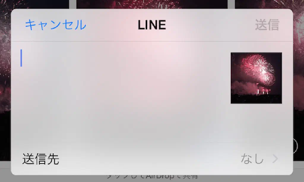 たくさん撮った写真の中にはLINEにいっぱい共有したいものがあるかもしれません。たとえば、この花火の写真。すぐにでも誰かと共有したいですよね。この場合も共有メニューが役に立ちます。共有メニューのアイコンをタップします。