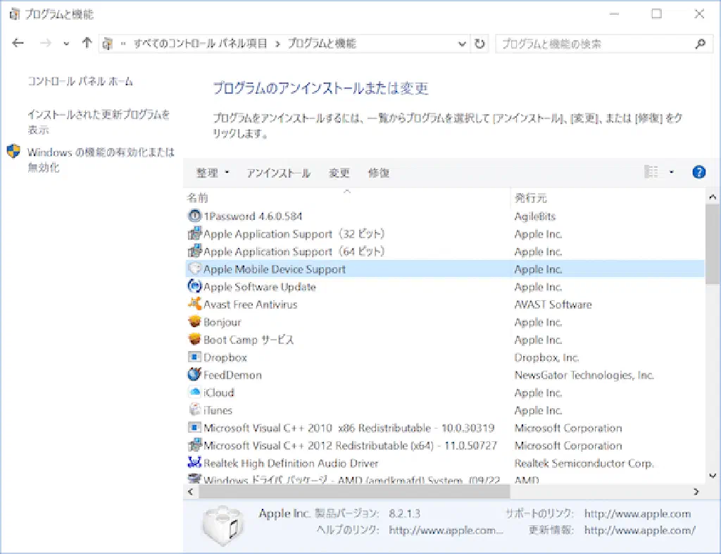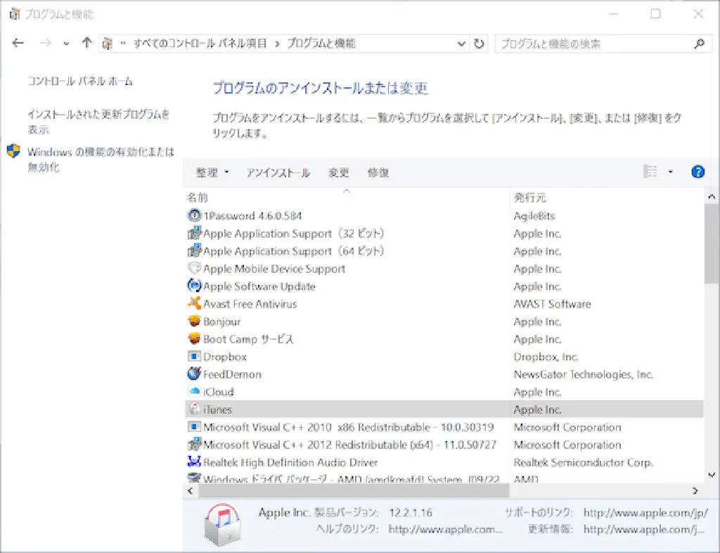 コントロールパネルから「プログラムと機能」を開き、iTunesをいったん削除した後、最新版を再インストールします。