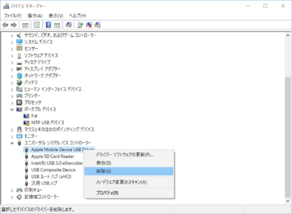 誤って「Apple Mobile Device USB Driver」のドライバーソフトウェアを削除してしまった場合