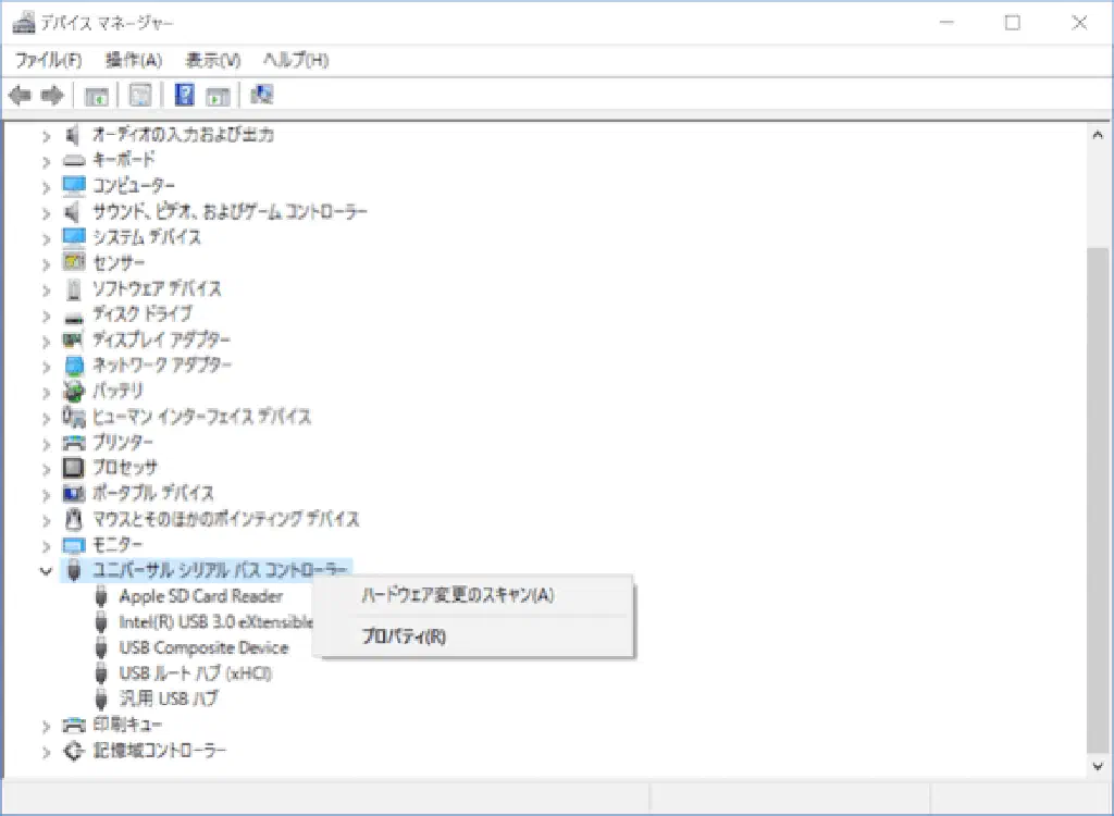 「ユニバーサルシリアルバスコントローラー」を右クリックして、「ハードウェア変更のスキャン」をクリックします。再度、「Apple Device USB Driver」が表示されることを確認します。