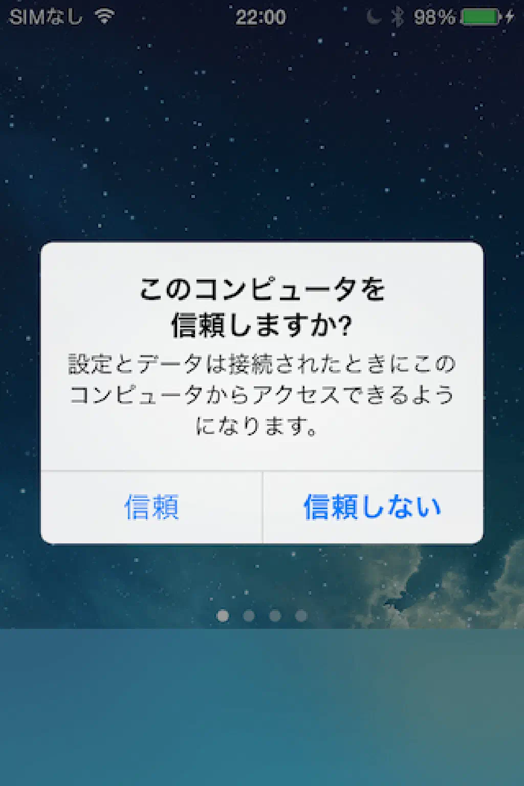 はじめてiPhoneをPCに接続した場合、iPhone側で以下のようなダイアログが表示されます。忘れずに「信頼」をタップしておきましょう。