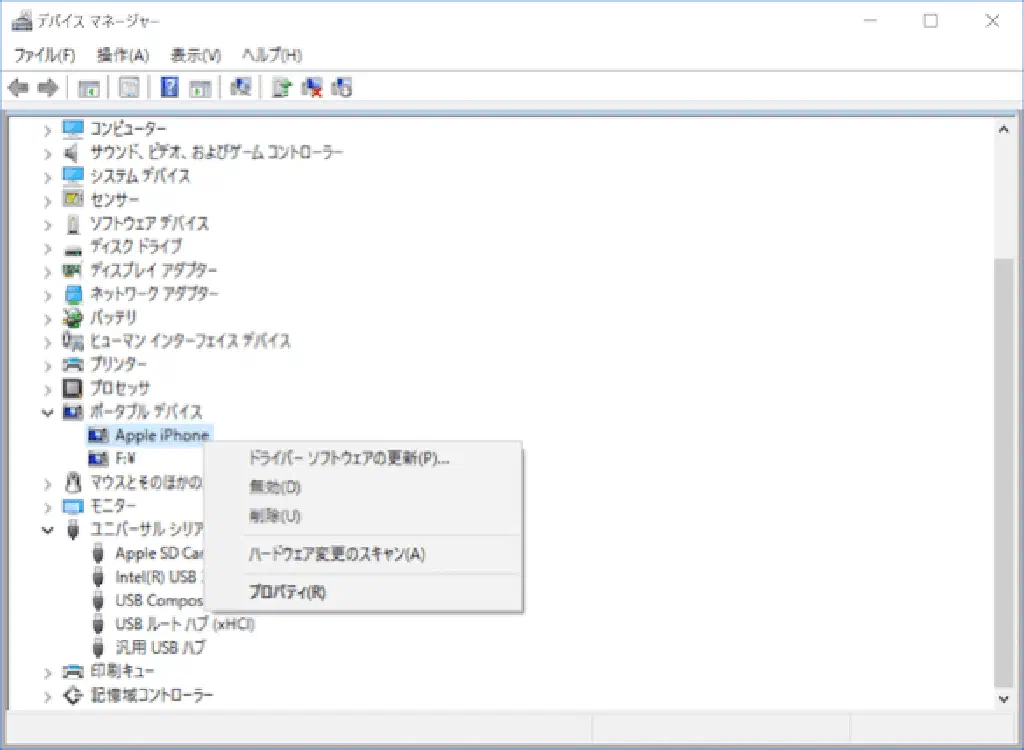 iPhoneを接続した状態で、「Apple iPhone」というデバイスを探します。「Apple iPhone」を右クリックして「ドライバーソフトウェアの更新」をクリックします。