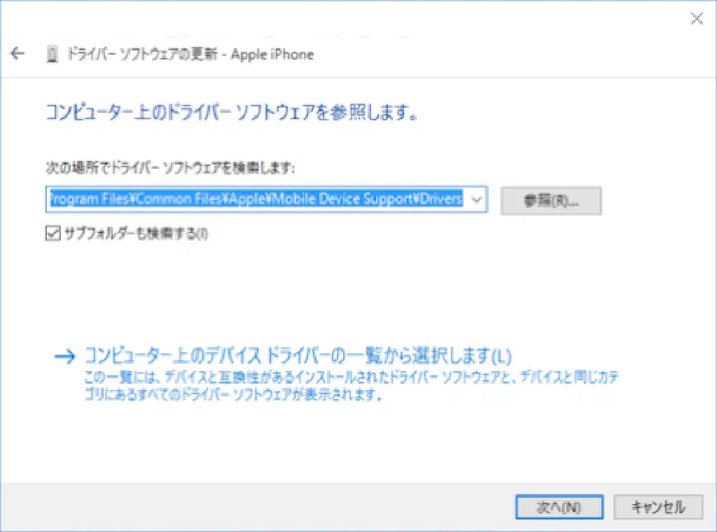 「次の場所でドライバーソフトウェアを検索します」に、以下のパスを入力します。