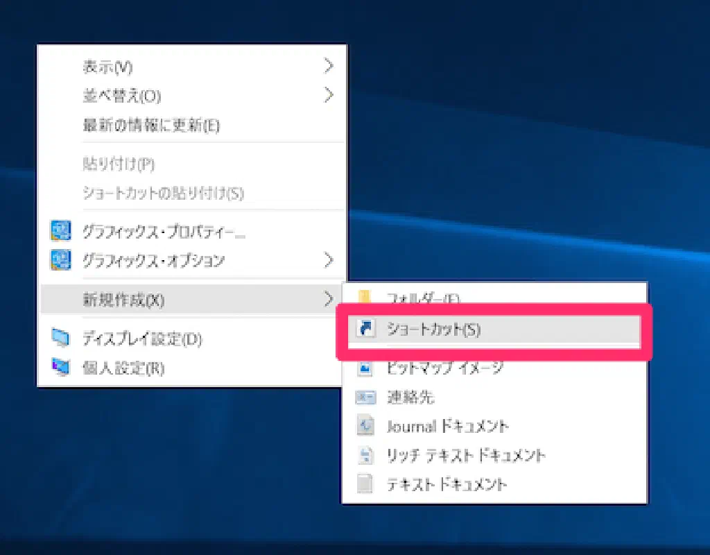 デスクトップ上で右クリックして、「新規作成」→「ショートカット」を選択します。