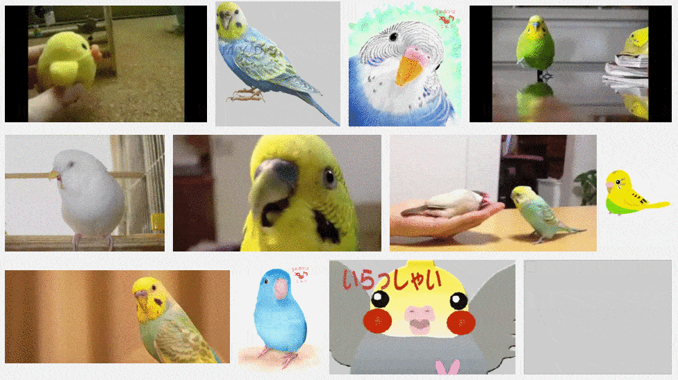 Google 画像検索にアクセスし、たとえば「セキセイインコ gif」で検索した結果が以下の画像です。通常、静止画として表示される画像がGIFアニメとして再生されています。検索時に「gif」と付与するとGIFアニメが見つけやすいです。