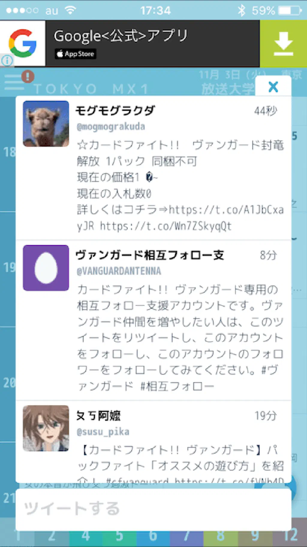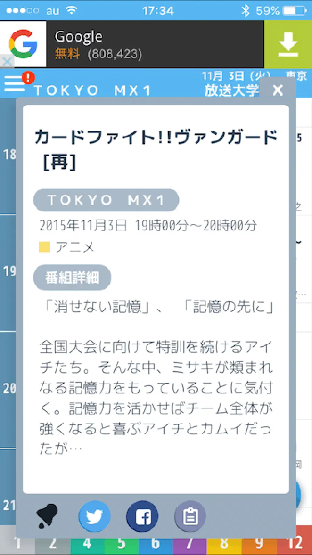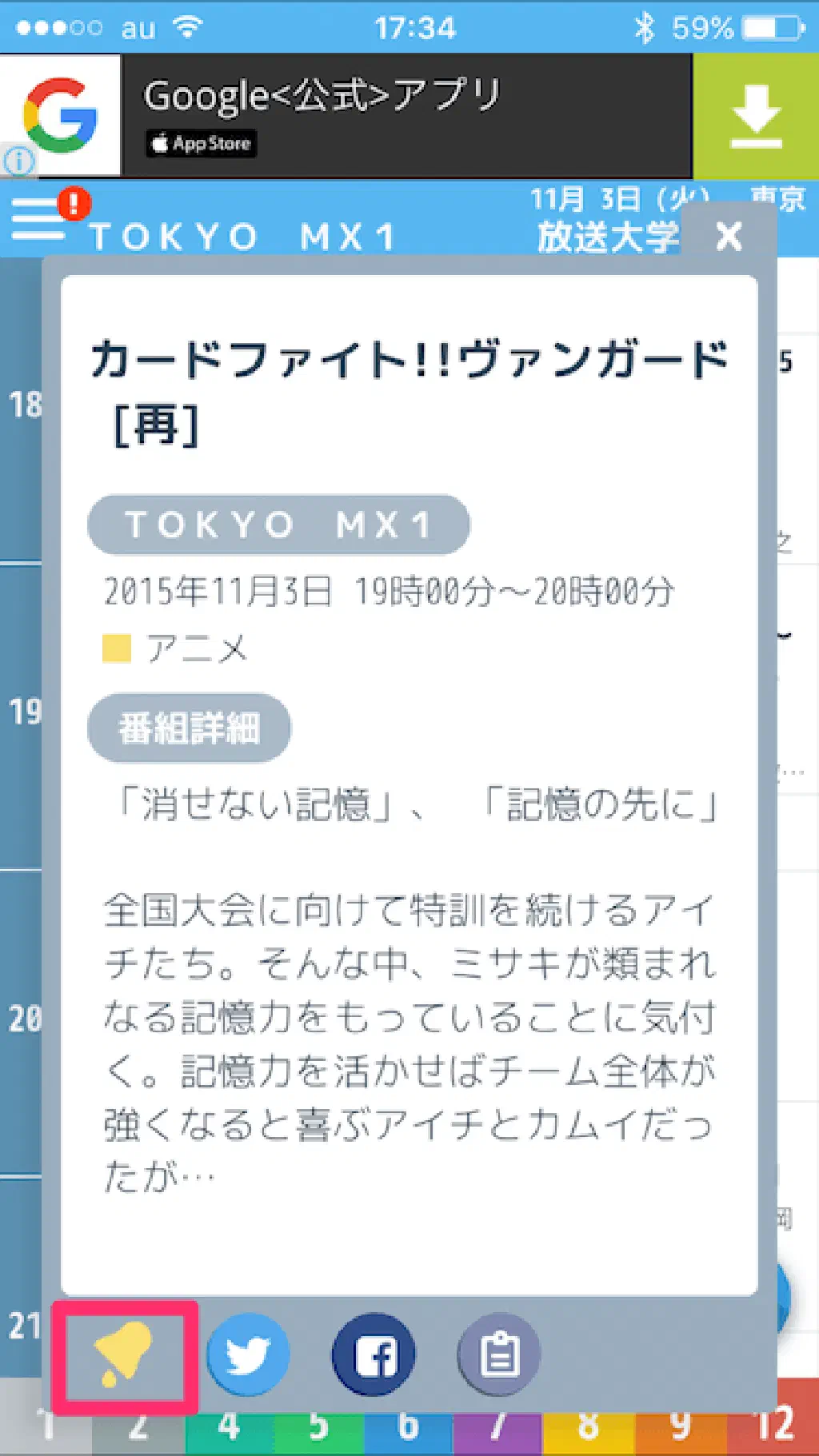 見たいテレビ番組表を長押しすると番組の詳細を見ることができます。詳細画面では番組を見逃さないためのプッシュ通知や、関連するツイート、Facebookへのシェア、番組名のコピーを行うことができます。