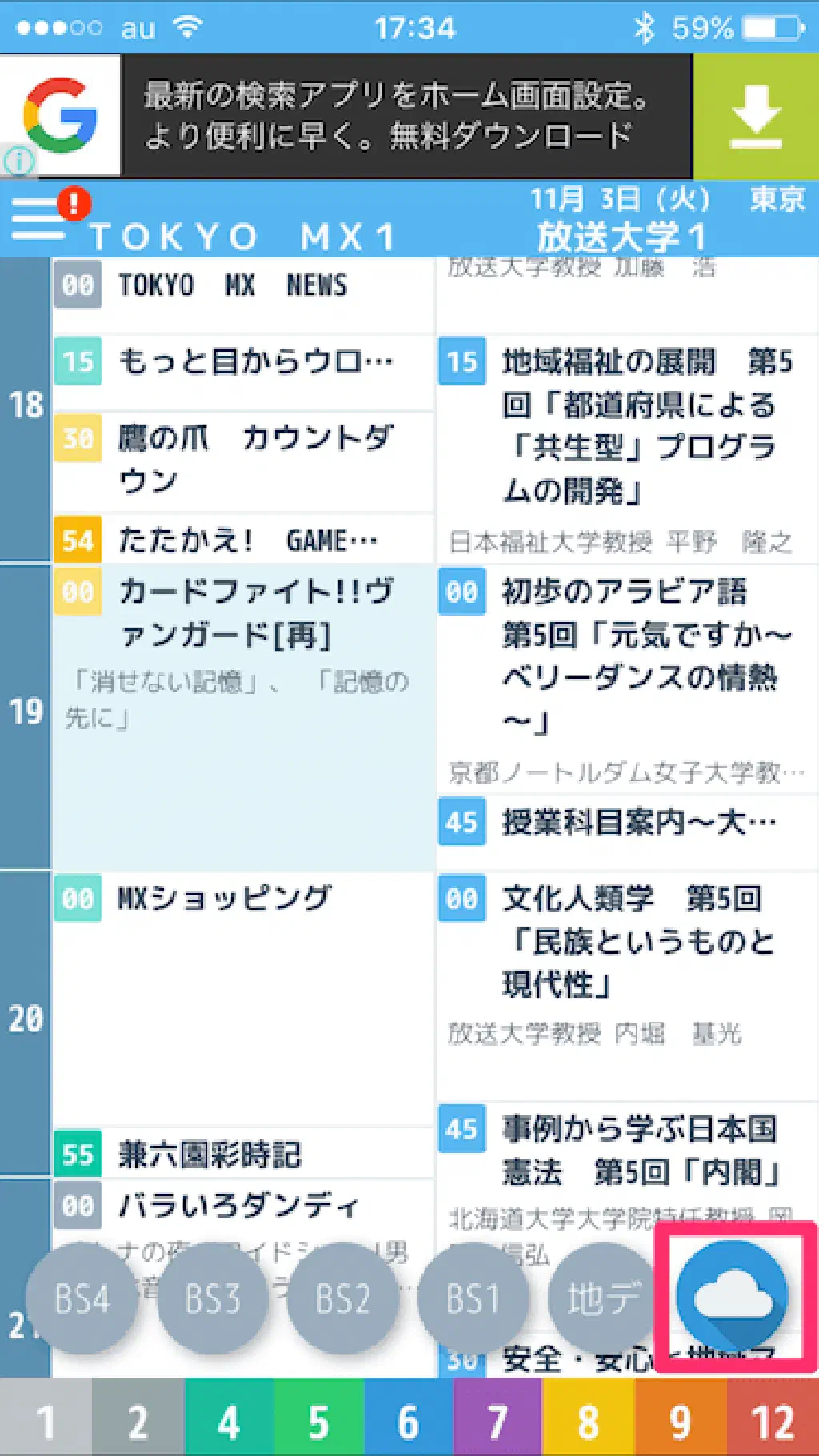 地上波、BS、CSの切り替えは、右下のボタンから行います。全テレビ局が網羅されていますので、このテレビ番組表1つですべての番組の詳細な情報を知ることができます。