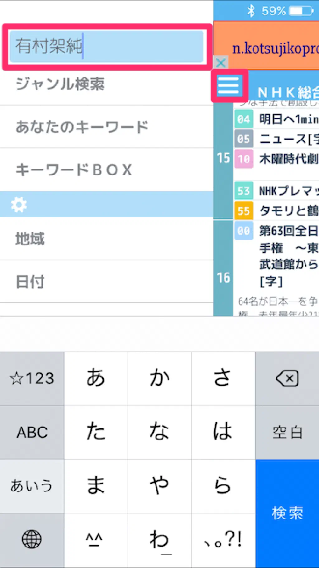 便利なのがキーワード検索。たとえば、好きな女優が出演するテレビ番組を検索したい場合は、メニューからキーワードを入力し検索します。