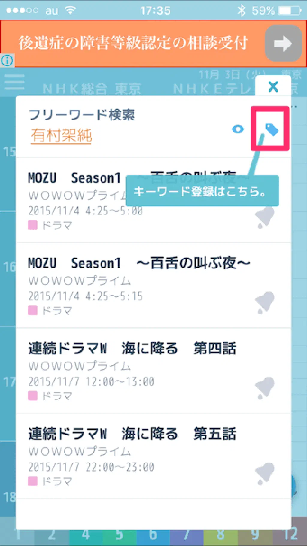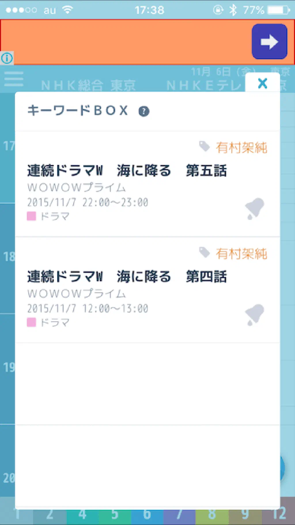 キーワードに登録した女優が出演するテレビ番組が新たに配信されることが分かった場合には、このようにキーワードBOXに通知される仕組みになっています。これで見たいテレビ番組を見逃すことがなくなります。