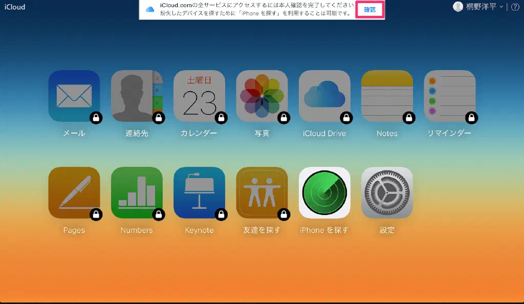 iCloud バックアップからカレンダーやリマインダーを復元するためには、以下のリンクにアクセスします。Apple ID で 2 段階認証を設定している場合(過去記事:Apple ID の 2 段階認証を有効にする方法 )、かつはじめて iCloud.com にログインする場合は、本人確認を求められます。バナーの「確認」をクリックします。