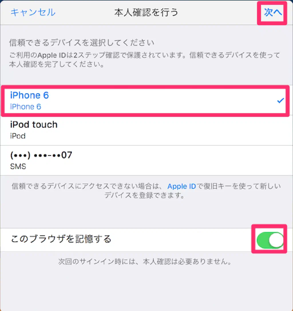 信頼できるデバイス、または電話番号を選択し、「次へ」をクリックします。「このブラウザを記憶する」をチェックしておくと、次回のアクセス以降、本人確認が不要になるため、必要に応じてチェックしておきましょう。