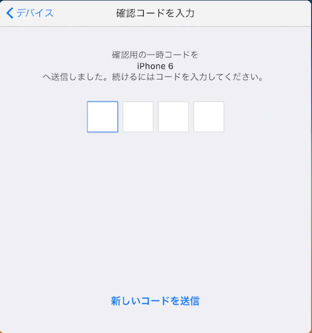 iPhone に表示された 4 桁の確認コードを入力します。なお、確認コードの有効期限が切れてしまった場合は、正常にログインできなくなりますので、「新しいコードを送信」をクリックし、新しい確認コードを発行します。
