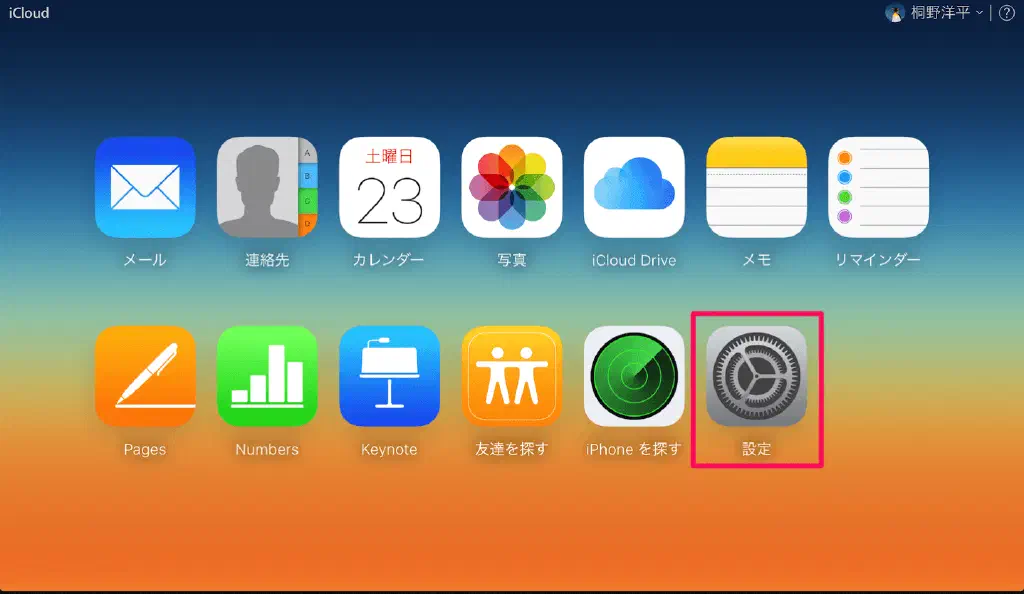 iCloud.com の「設定」をクリックします。