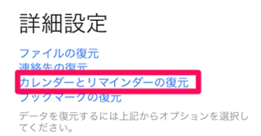 画面最下部の「詳細設定」から「カレンダーとリマインダーの復元」をクリックします。