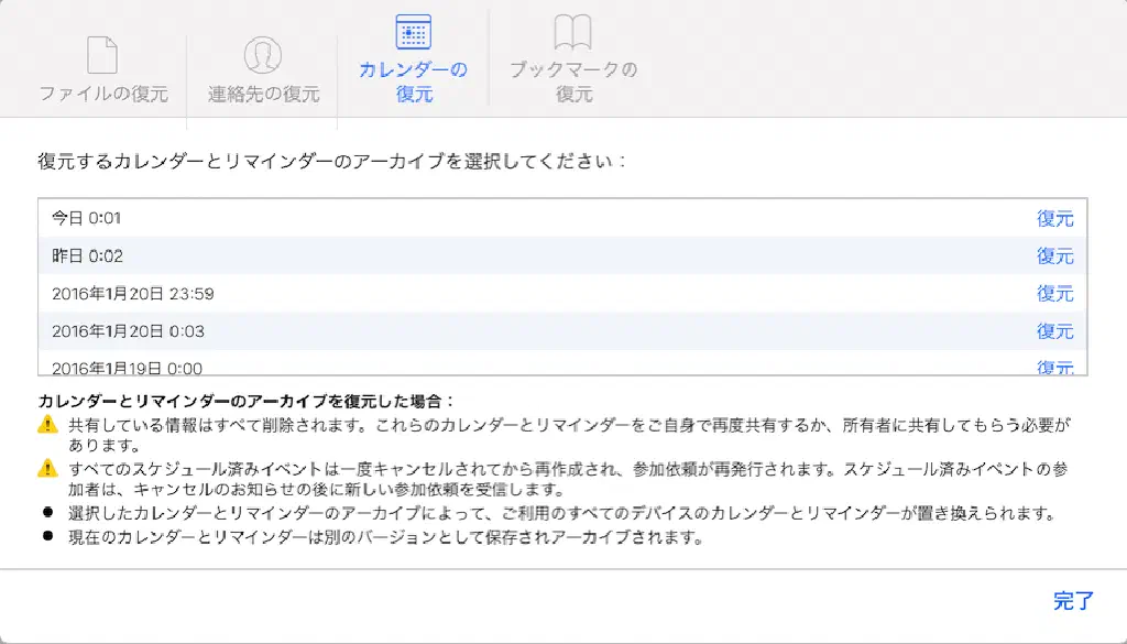 iCloud.com からカレンダーとリマインダーを復元する方法