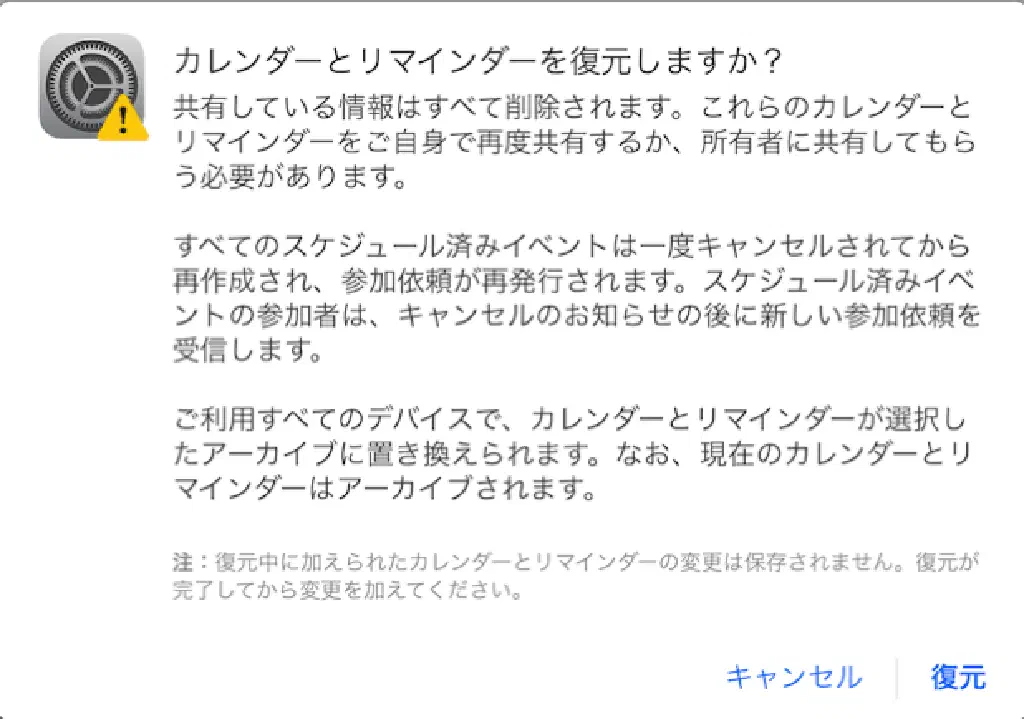 共有作業を忘れてしまった場合、共有相手のカレンダーやリマインダーに過去のイベントが表示されなくなってしまうため、注意が必要です。この点に留意して復元作業を行ってください。なお、iCloud バックアップ以降の時間に作業した内容はすべて失われてしまうため、復元作業は慎重に行ってください。