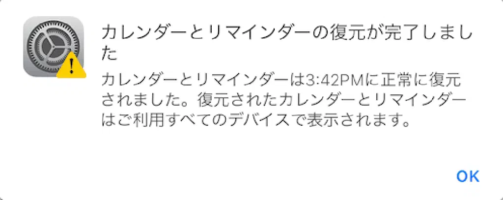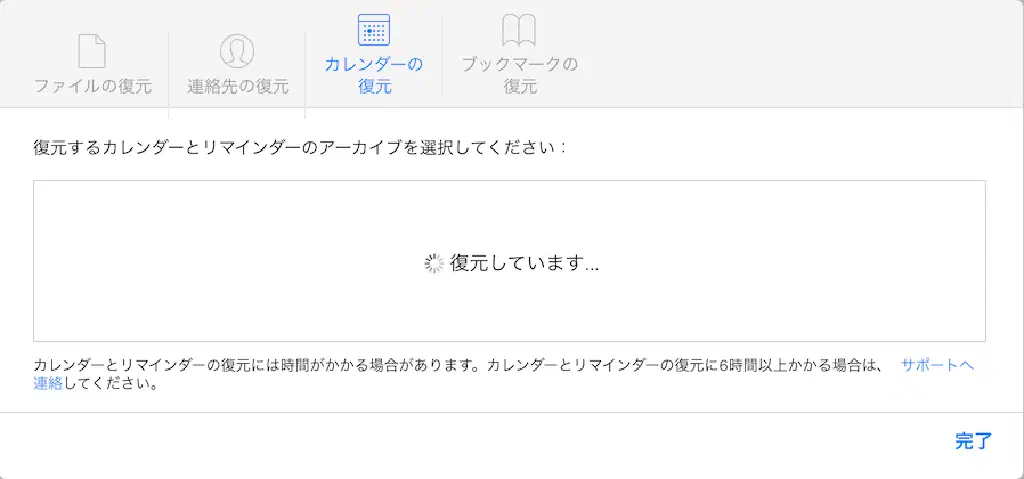 復元にはカレンダーやリマインダーの内容によって異なりますが、時間を要します。手元の iPhone で試した場合、10 分程度の時間を要しました。復元が完了した場合、Apple ID に登録しているメールアドレス宛に、復元が完了した旨のメールが届くため、それまでは別の作業をしていても良いでしょう。