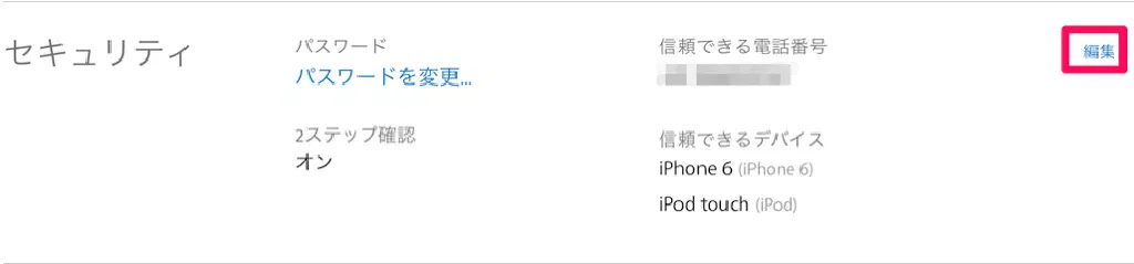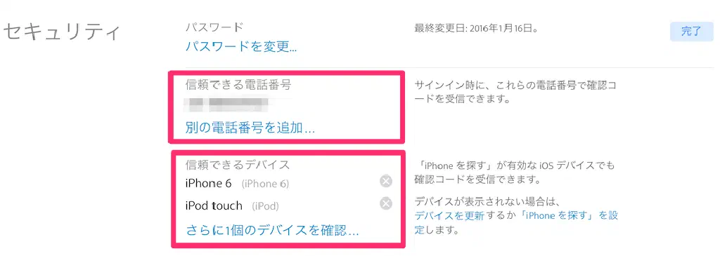 「セキュリティ」欄の「信頼できる電話番号」、または「信頼できるデバイス」から、電話番号、またはデバイスを追加できます。