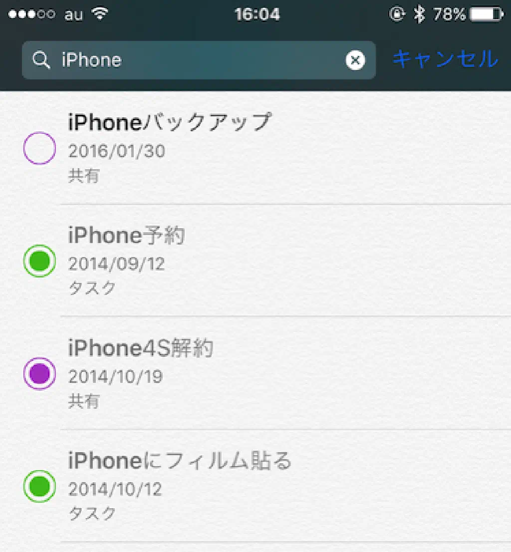 たとえば、「iPhone」と入力した場合、このようにすでに完了済みのリマインダーも含めて、すべてのリマインダーが表示されます。また、どのリストに登録されているリマインダーか、画面で確認できます。
