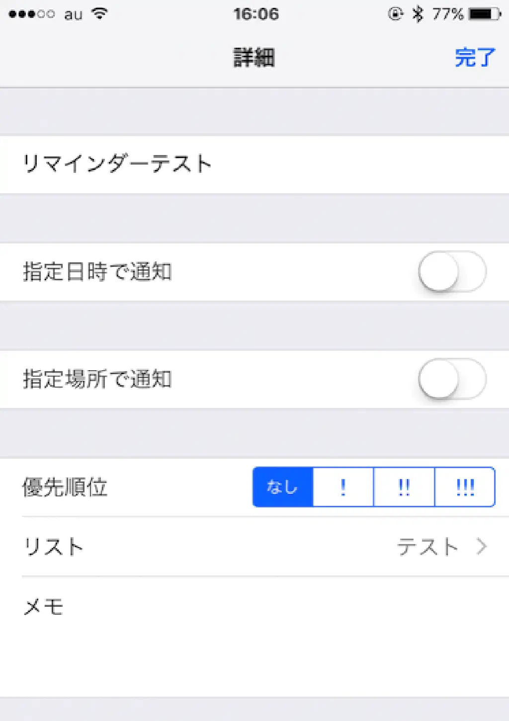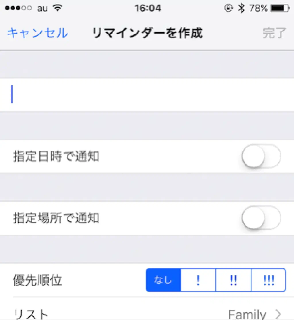 リマインダーの作成画面はこの通り非常にシンプルです。入力できる項目は、前述の通り、「指定日時で通知」「指定場所で通知」「優先順位」「リスト」「メモ」です。