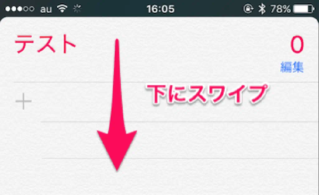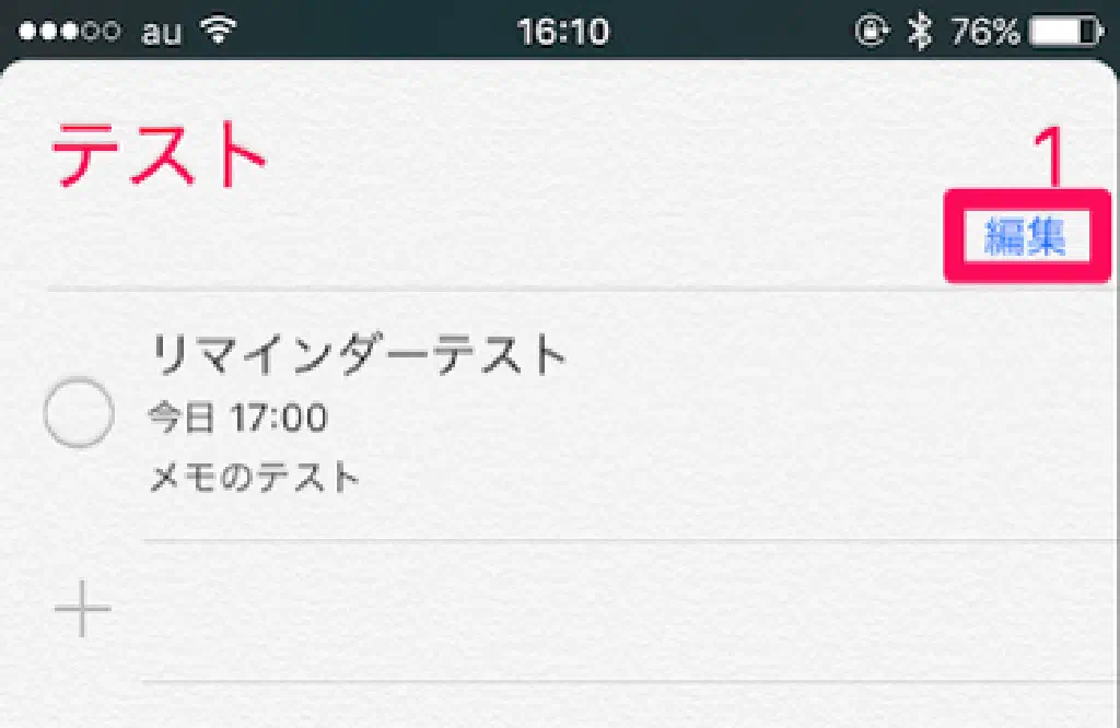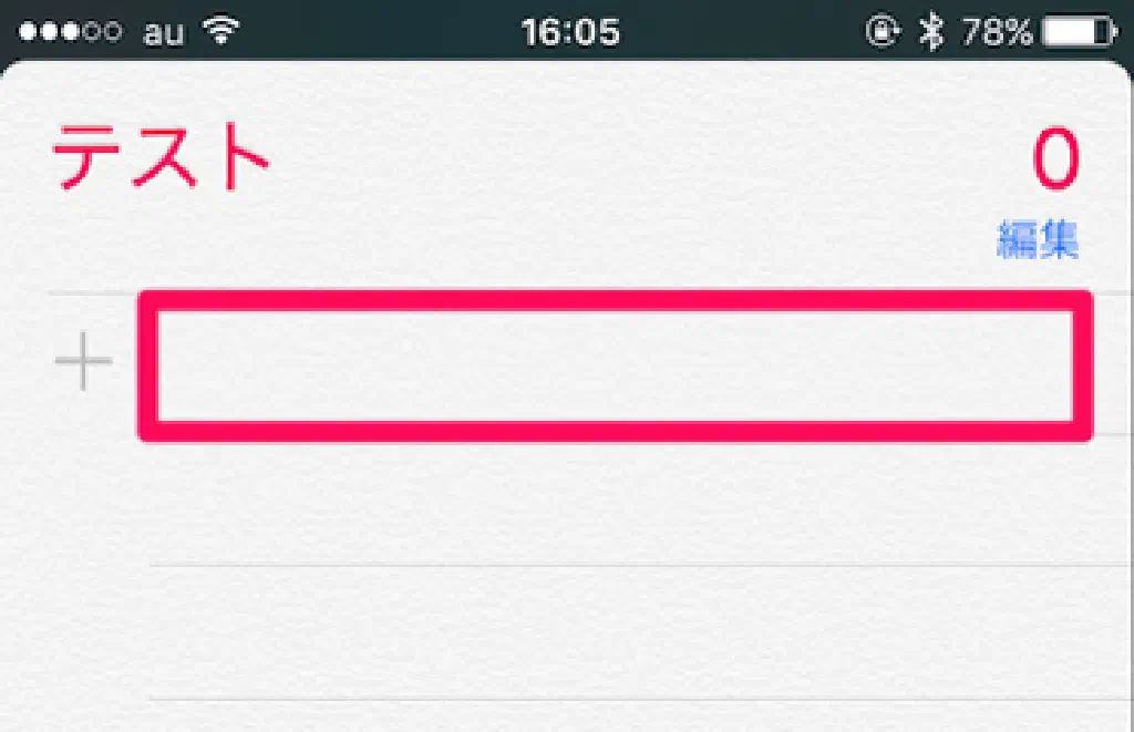 「テスト」に登録されているリマインダーの一覧が表示されます。今回の場合、新規登録したリストにリマインダーを登録するため、まだリマインダーが存在していない状態です。「+」と書かれた横のスペースをタップするとリマインダーの名称を入力できます。