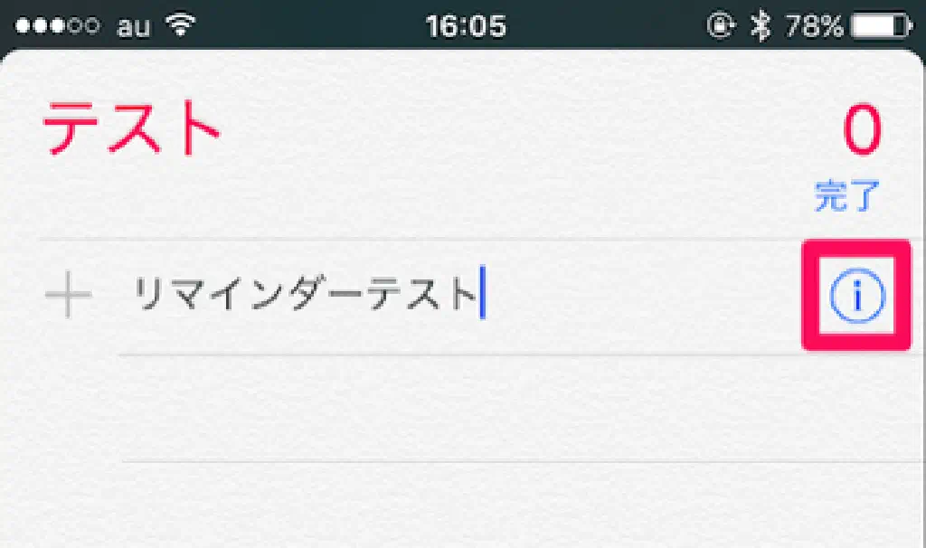 リマインダーは、性質に応じて、リマインダーを起動する日時や場所など、細かな設定を行うことができます。詳細な設定を行う場合は、リマインダーをタップした状態で「i」をタップします。