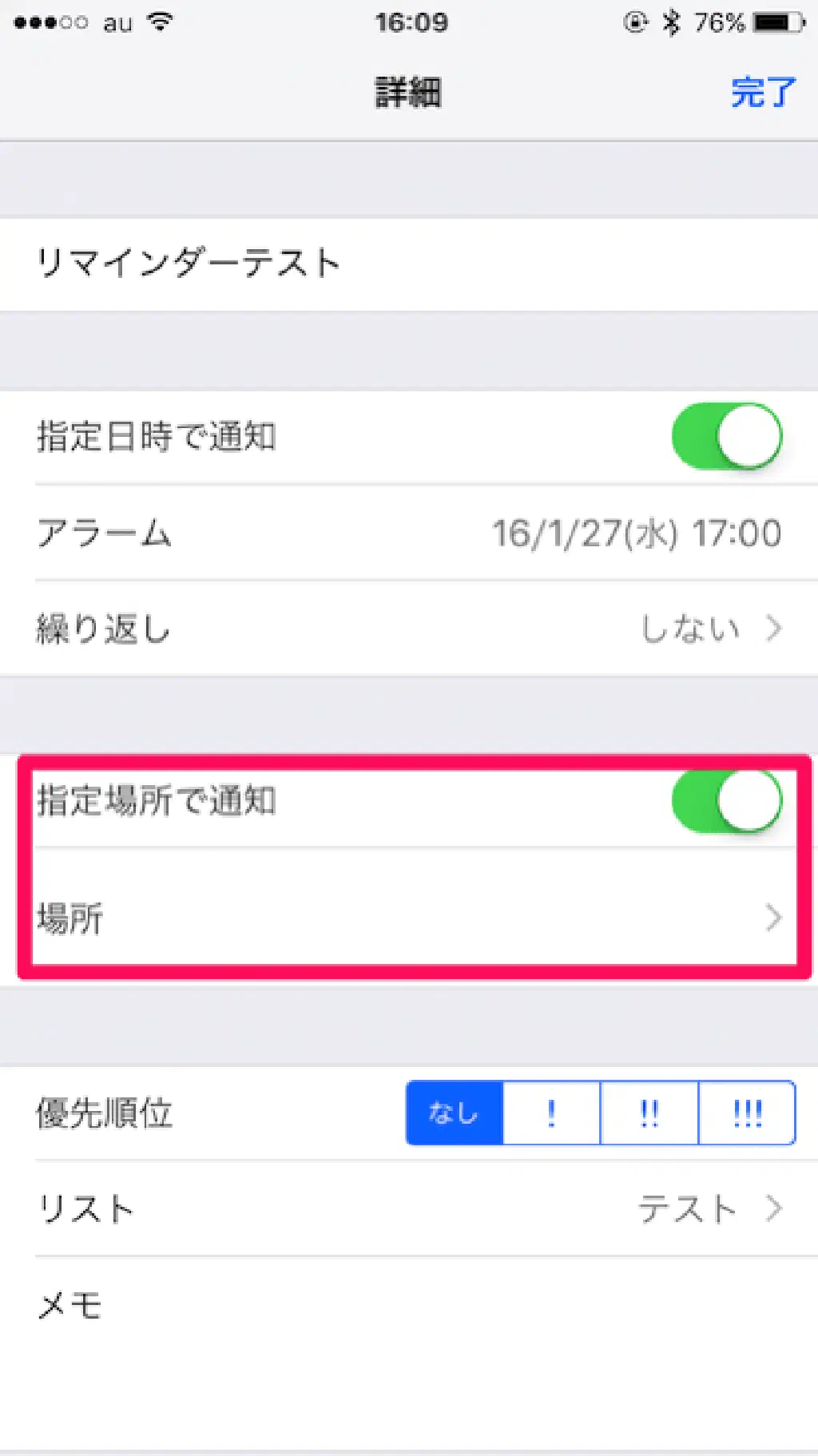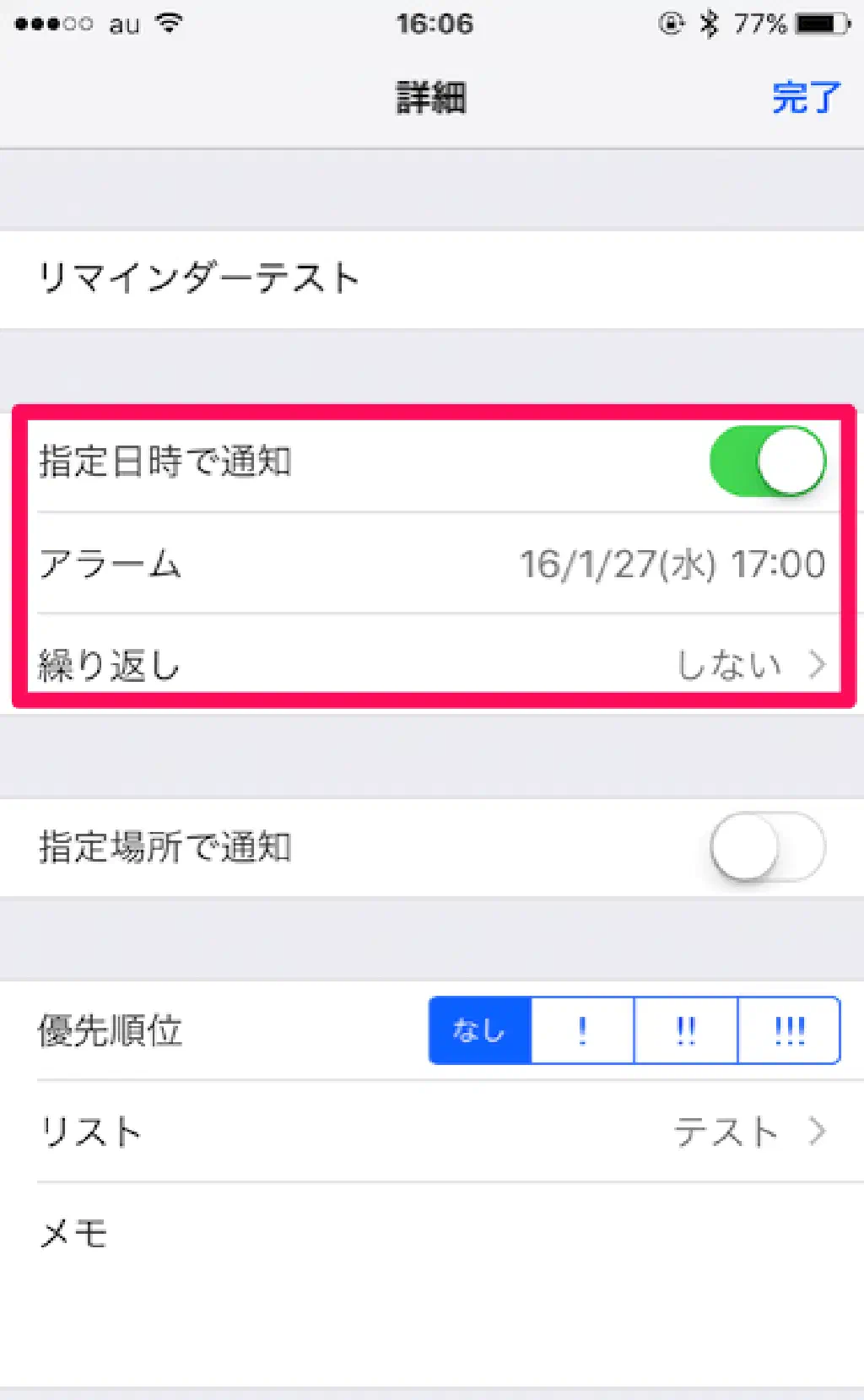 リマインダーの名称や通知方法、優先順位、リストを複数作成している場合はどのリストに登録するか、またリマインダーに関するメモ書きを設定できます。