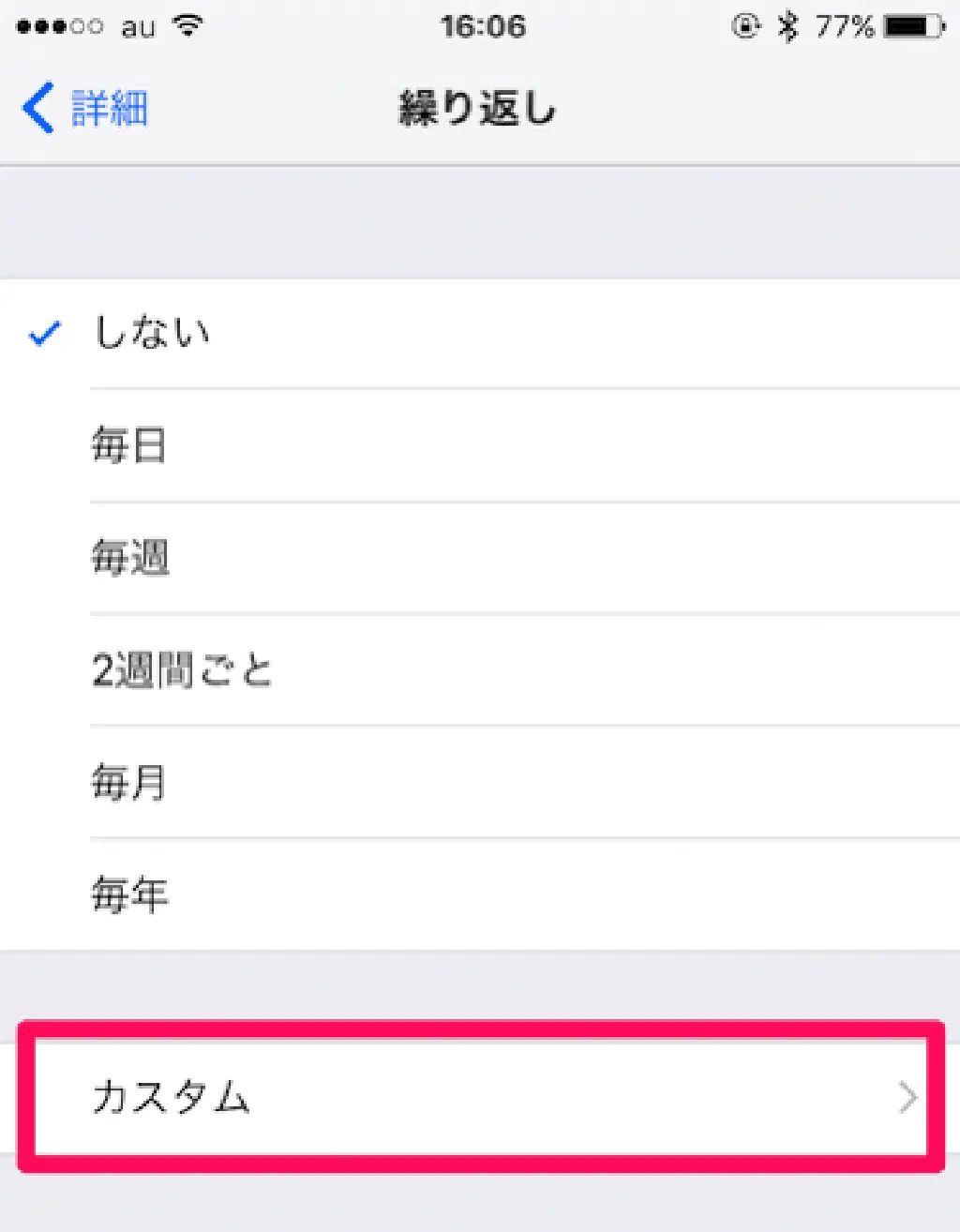 リマインダーの作成画面で「繰り返し」をタップすると、たとえば、毎日起動するリマインダー、毎週起動するリマインダーを作成できます。デフォルトでは「毎日」「毎週」「2 週間ごと」「毎月」「毎年」が指定できます。しかし、デフォルトのままでは、たとえば**「燃えるゴミの日の前日の 17 時に通知する」**など、1 週間に複数回起動したいリマインダーを作成することはできません。(もちろん、火曜日と木曜日に通知する 2 つのリマインダーを作成することで、実現することも可能です)このような複雑なリマインダーを作成したい場合は、「カスタム」をクリックします。