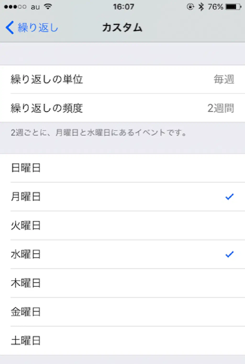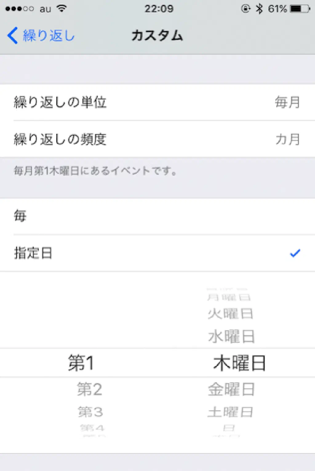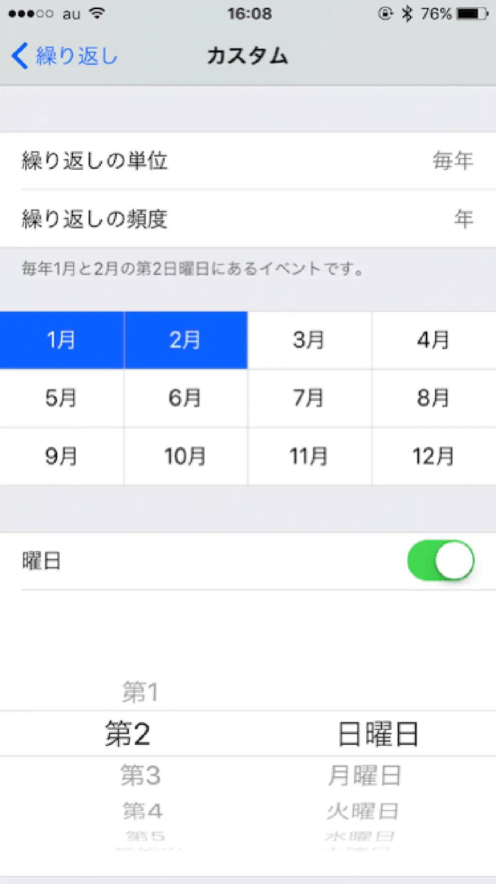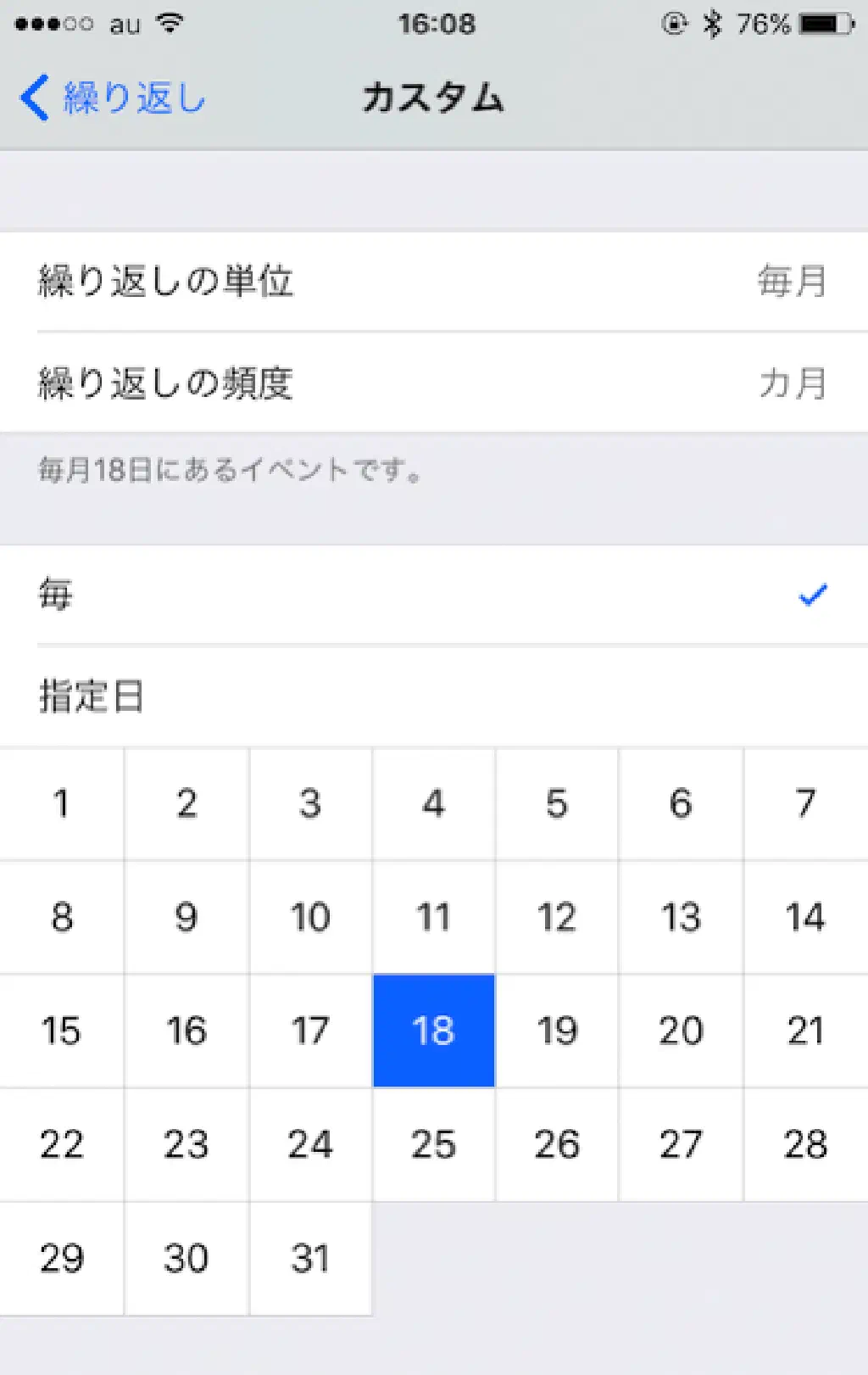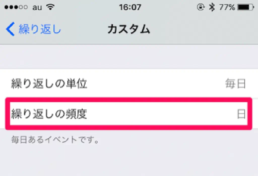 繰り返しの単位は、「毎日」「毎週」「毎月」「毎年」から選択することが可能です。さらに、繰り返しの単位に応じて「繰り返しの頻度」を選択することが可能です。